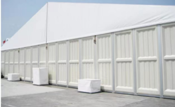 Walls: Heavy duty white 650g/sqm PVC fabric, semi-blockout, 100% waterproof, fireproof (DIN4012 B1, M2), UV resistant.
